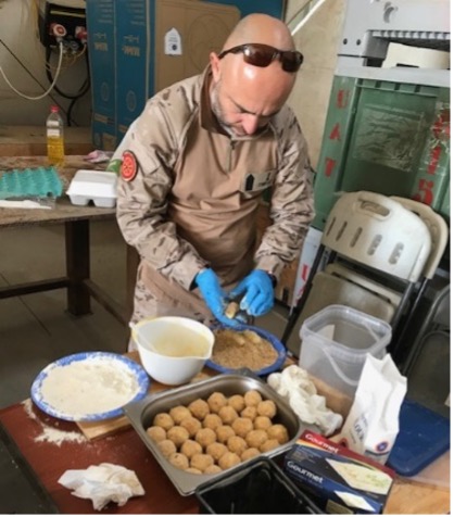 To boost morale among all U.S. military units with International Coalition Partners deployed to BDSC, she organized three international military instructors and more than 26 students for Beginner to Conversational English Classes and Beginner Italian Language Classes. She also assembled three additional international military instructors to teach International Cooking Classes with Cultural History lectures in addition to U.S. Forces activities. All activities were held away from the closed Red Cross hospitality house. Coordinated activities – without Lisa Ann’s presence – were well attended at open air military compounds and the MWR Pavilion. Observing 6-foot distancing and masks requirements outdoors varied.