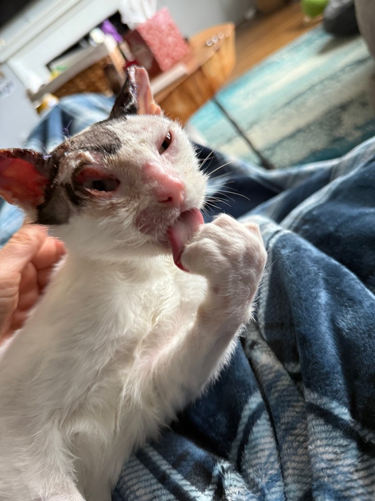 The prime ingredient for recovery involved focused care. At the clinic, the kitty—nicknamed Marsha—was medicated and received the first of several surgeries. Sometime later, after the initial emergency treatment had been administered, the clinic transferred Marsha to the East Bay SPCA (EBSPCA), where, according to Jessica, “She was on around-the-clock care while they had to do dressing changes and anesthetize her.” For three more weeks, Marsha received intensive tending until her wounds had healed enough that Jessica could take over as a foster caregiver.