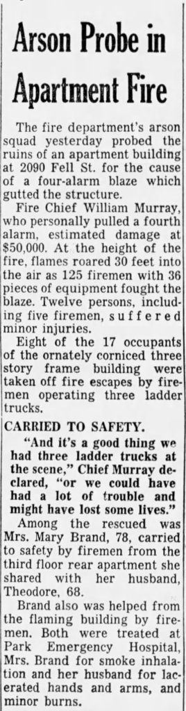 October 20, 1957 newspaper clippings of the 4-alarm fire that took place on Fell St.