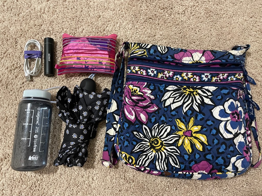 This may sound like a lot of supplies, but they fit easily into an 11″x12″ purse. I keep many of these items in a small pouch, ready to tuck into whatever bag I bring that day. I’ve also invested in a travel-sized water bottle, umbrella and charging brick.