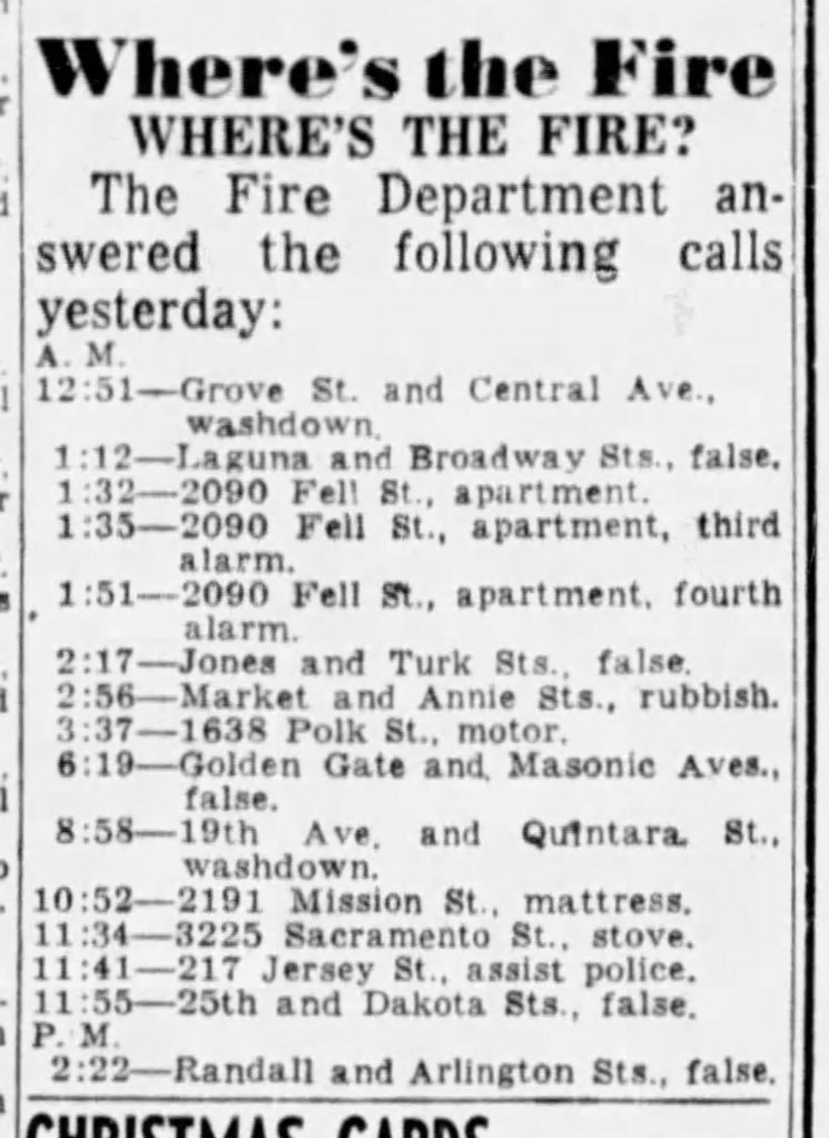 October 20, 1957 newspaper clippings of the 4-alarm fire that took place on Fell St.