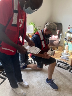 Red Cross volunteers Don Powell (left) and Ron Redmond (right) install smoke alarms in Burnie Gipson’s home in Martinez, Calif. on August 2, 2022. Photo by Marcie Wright-Powell/American Red Cross